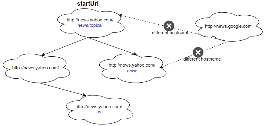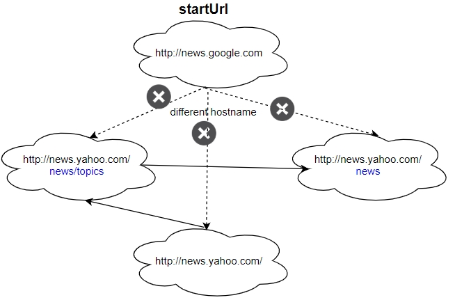 Explanation: The startUrl links to all other pages that do not share the same hostname.
